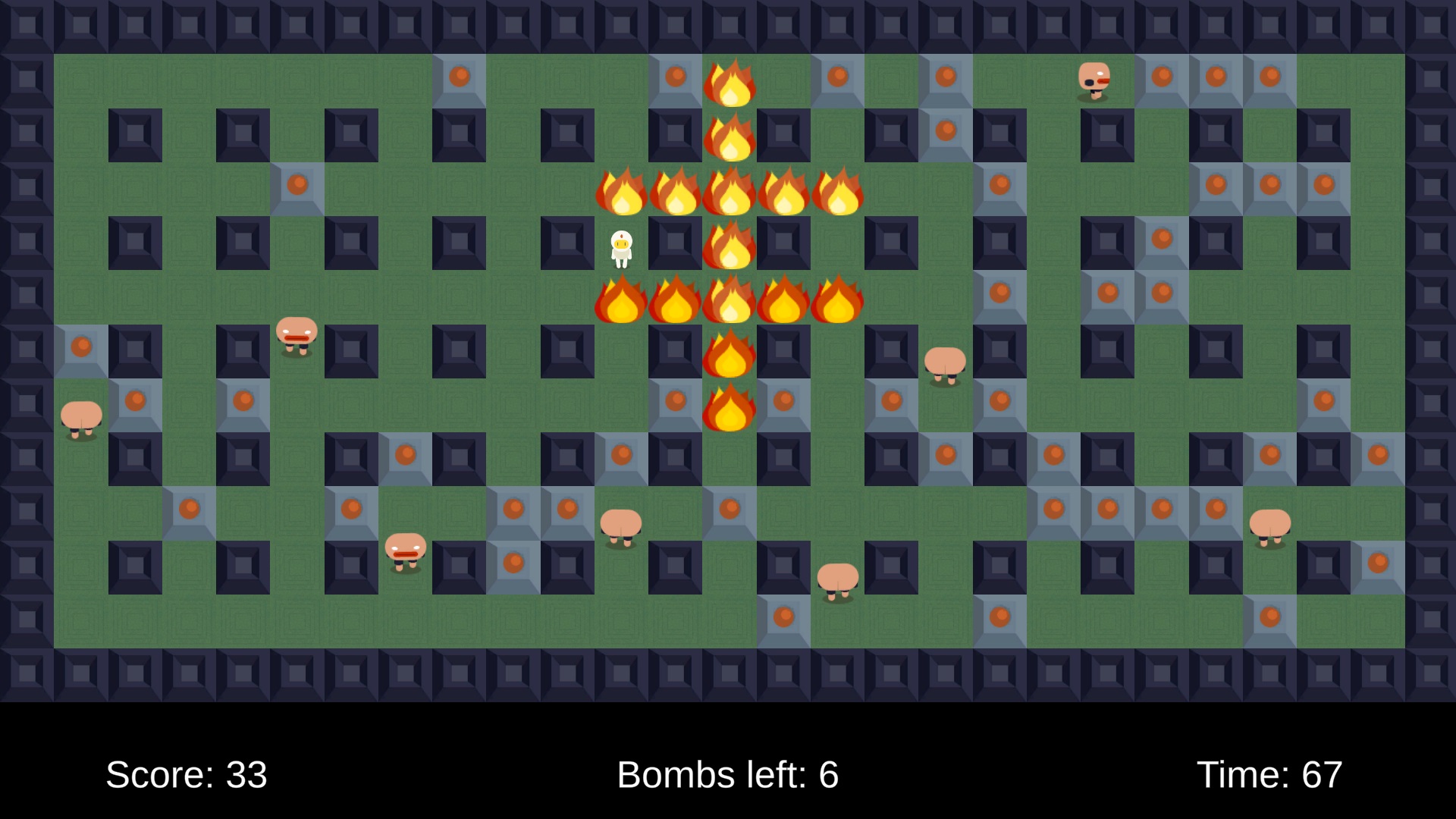 Bombing Chap is an arcade-like Bomberman Clone. The player can lay bombs and gets points for killing enemies. He also gets bonus points for completing the level before the time runs out. For this project, I used free Artwork.